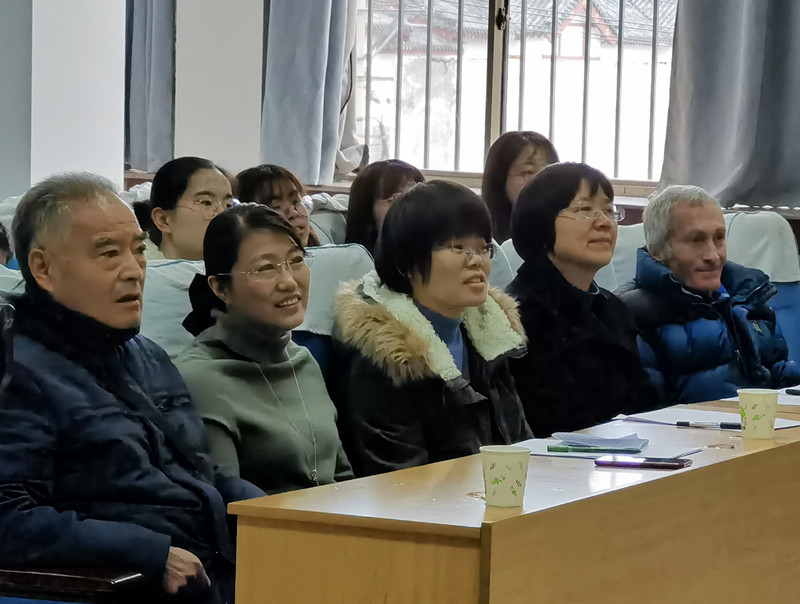 退休教师代表李明启老师参加,英语系主任高歌副教授、王莉副教授、法语系主任唐友霞老师、外教Roger Louis担任本次比赛评委。