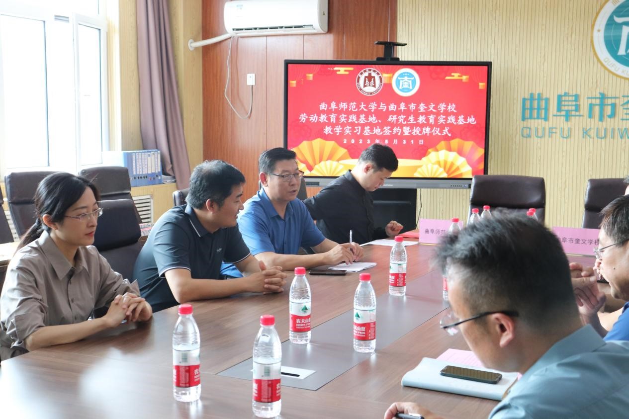 仪式上,曲阜市教育局总督学刘群、曲阜市奎文学校校长孔强等学校教师对我校一行人表示了热烈欢迎。会议伊始,直播8官网 党委副书记王作茂进行发言,对曲阜师范大学和直播8官网 的基本情况进行介绍,希望直播8官网 与曲阜市奎文学校以习近平总书记关于教育的重要论述为指导,全面贯彻党的教育方针,牢固树立教育发展新理念,按照拓展教育教学实践场所,满足多样化实践需求的要求和协同共建、资源共享的指导思想,充分发挥双方自身专业优势和服务社会功能,为社会培养优秀人才,也希望双方开展深入合作交流,共同进步。