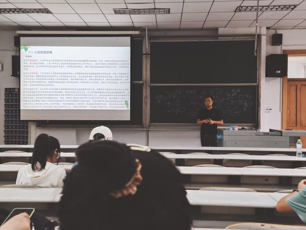 会上,赵文彬老师播放了征兵宣传视频。随后,赵文彬老师深入介绍了国防教育及征兵工作的基本情况,从征集对象、条件到报名时间与流程,进行了全方位的讲解。他强调了当前国防与军队建设对高素质人才需求的迫切性,同时指出了服役待遇、退伍补偿等相关优惠政策。赵文彬老师结合退役学生的自身经历,给同学们描述了真实难忘的军旅生活,鼓励同学们将征兵入伍作为一个提升自我的桥梁,将个人理想与富国强军结合,把个人成长融入强国之梦当中。在互动环节,毕业生们纷纷就自己关心的问题踊跃提问,现场气氛热烈非凡。