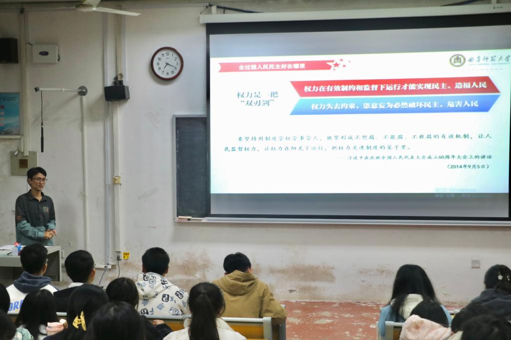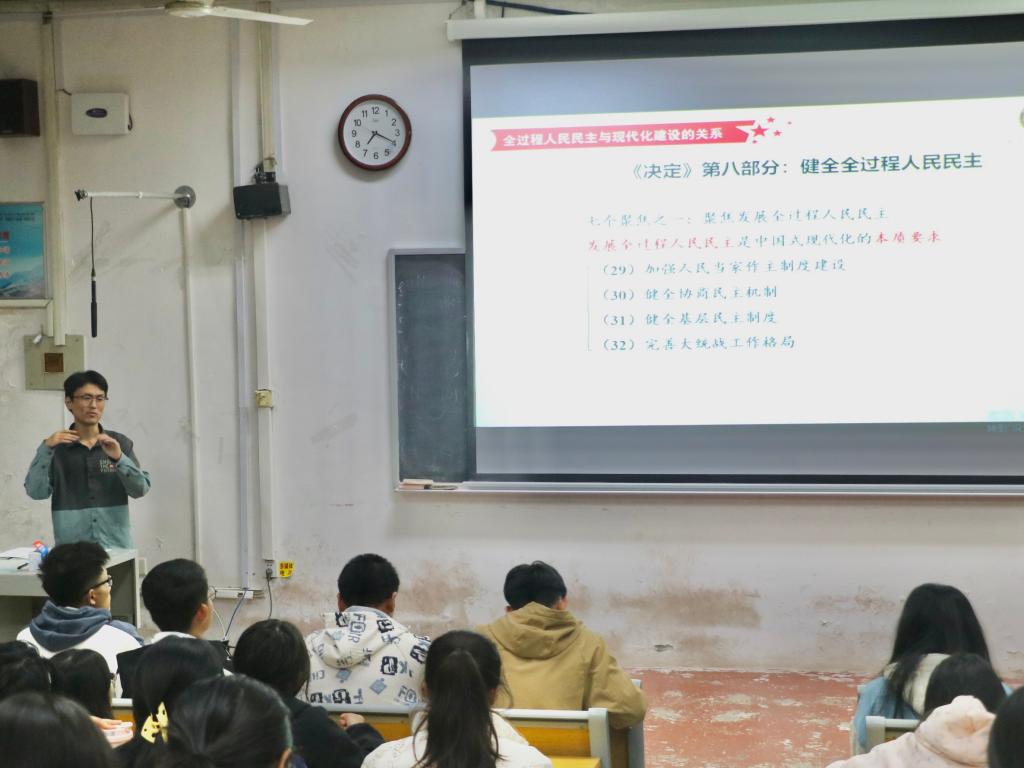 活动的第一部分聚焦于“全过程人民民主”的核心理念,探讨了“全过程人民民主的内涵”、“其优越性所在”以及“全过程人民民主与现代化建设的紧密联系”。宣讲人杨科智紧密围绕党的二十届三中全会精神,深刻剖析了会议的重大意义、核心内容及精神实质。他通过班级中的班委选举等身边小事,生动形象地阐释了人民民主的内涵,并详细解析了全过程人民民主的全方位、全链条、全覆盖三大特点。现场听众全神贯注,认真记录,气氛活跃。