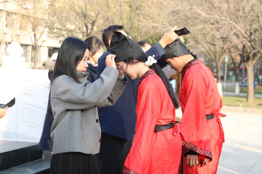 活动伊始,参礼学子身着礼服从容入场,行至孔子像前肃立,正衣冠、行礼仪。按照传统成人礼规制,由三位老师作为正宾为男生加冠、女生加笄,对他们跨入成人行列表示热烈祝贺和真诚祝福,学子们谦逊躬身,回应老师们的深切期待。随后,在学生代表于珂欣的带领下,全体参礼学子举起右拳庄严宣誓,承诺以“四有”公民为标尺,遵守法律法规、拥护党的领导,以求索真知、雕琢自我的态度,为国家发展与民族复兴不懈奋斗。活动最后,学子们向至圣先师孔子行揖礼,以致敬文脉、寄托初心。