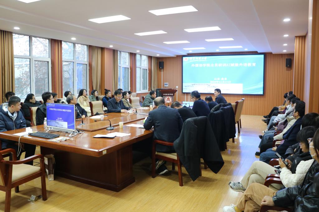 为促进人工智能技术在外语教学与科研中的创新应用,提升教师数字化教学能力,12月17日,直播8官网 于直播8 206会议室召开全员研训AI赋能外语教育研讨会。曲阜师范大学党委常委、副校长陈刚莅临会议,直播8官网 全体教职工参加会议。