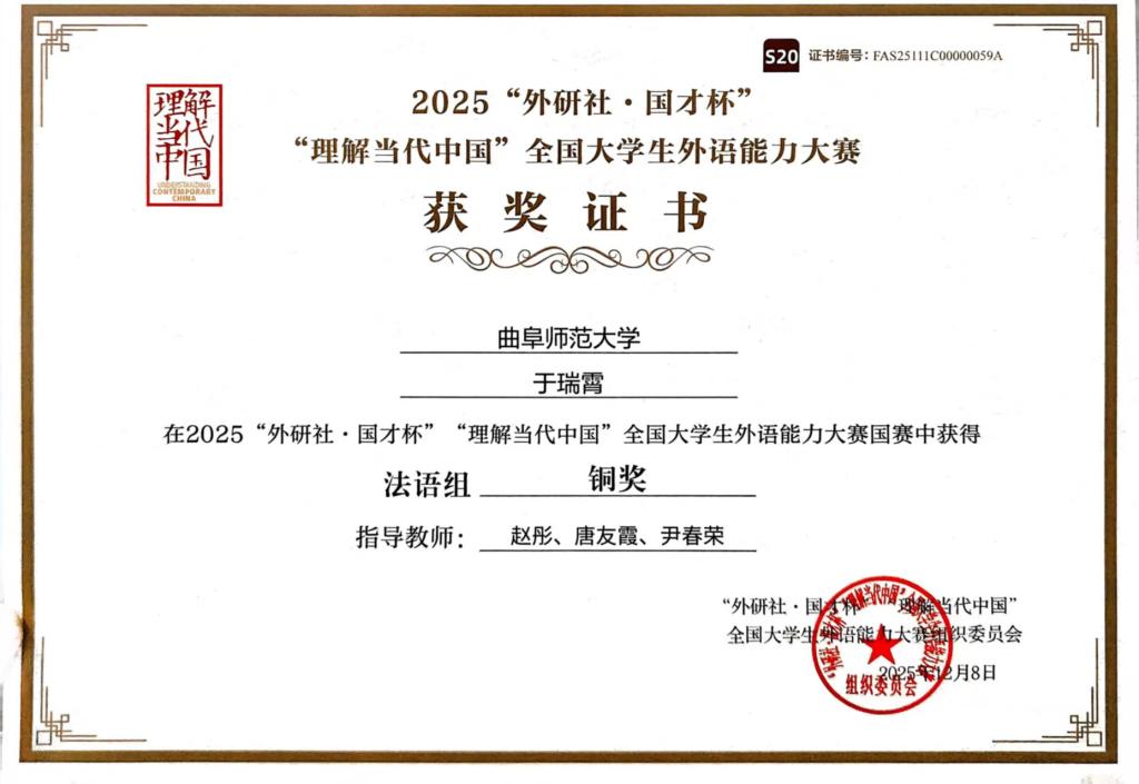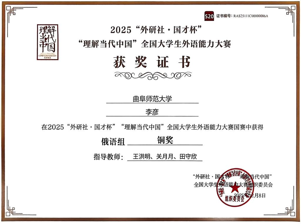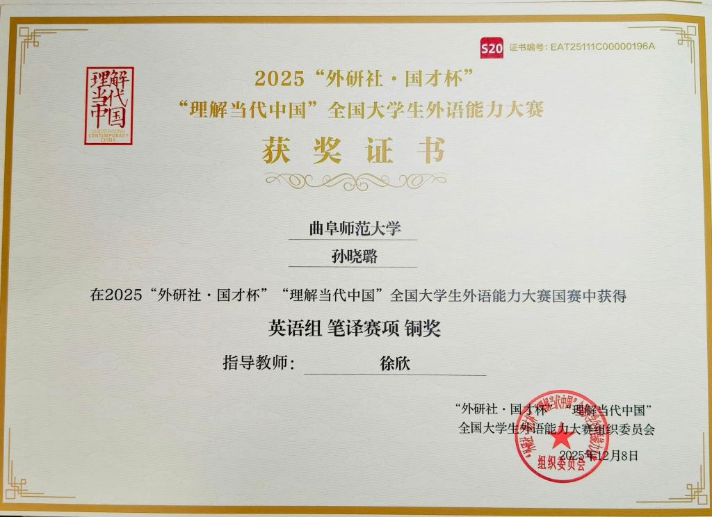 英语专业杜鑫柠(指导教师:秦洪武)获得英语组(综合能力)国赛银奖,孙晓璐(指导教师:徐欣)获得英语组(笔译)国赛铜奖,俄语专业李彦(指导教师:王洪明、关月月、田守欣)获得俄语组国赛铜奖,法语专业于瑞霄(指导教师:赵彤、唐友霞、伊春荣)获得法语组国赛铜奖。