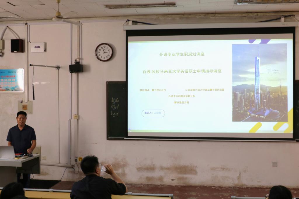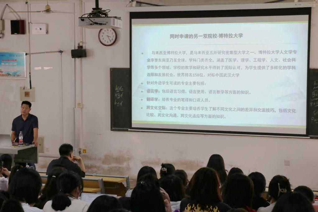 会议伊始,孟现朋老师列举了外语专业的就业发展方向,指出随着现今国内社会的就业压力不断增大,出国读博读研成为一种求学新方式。随后,孟老师从国内外语言环境、读博读研费用、学校排名、就业前景等方面全面讲述了马来亚大学的突出优势。最后,孟老师还介绍了本科专业申请的注意事项以及出国深造的就业前景,提出出国读博读研仍需加强专业基础知识,提升自身专业技能,积累更多经验。会议期间,学生们认真听讲,并结合自身实际积极思考,对未来有了更加清晰的认识与规划。