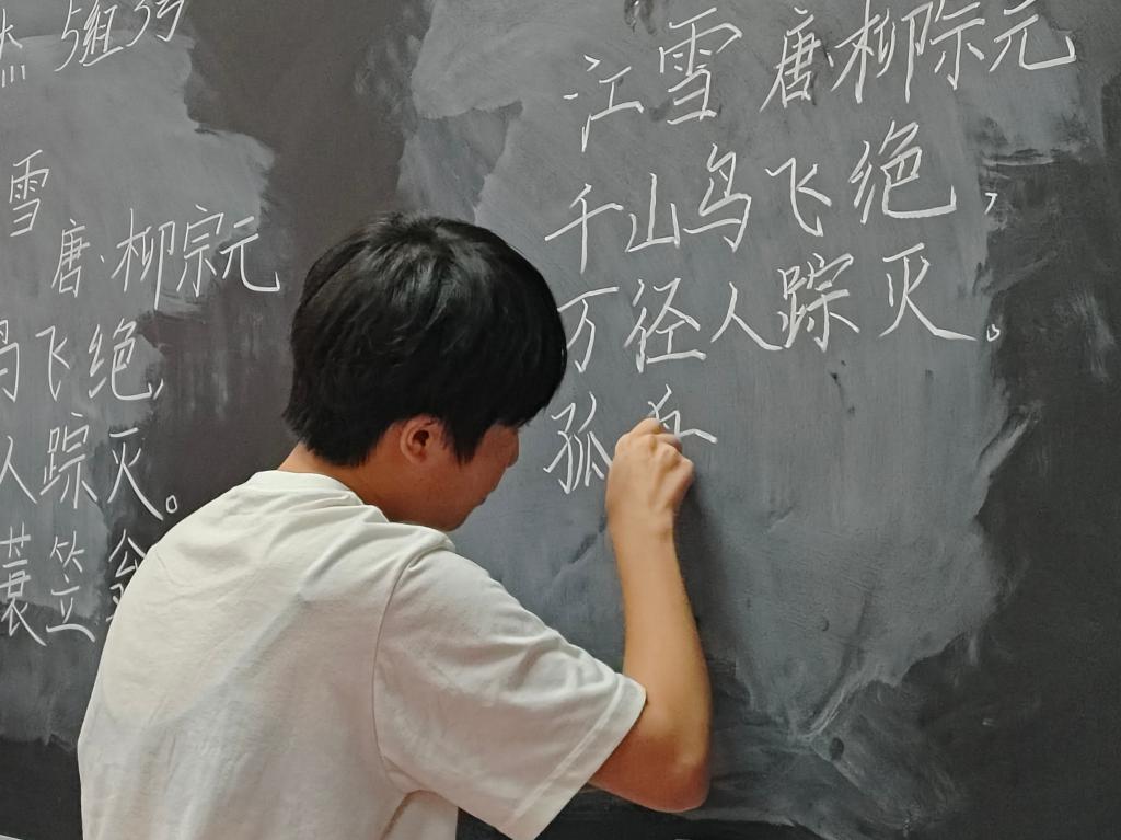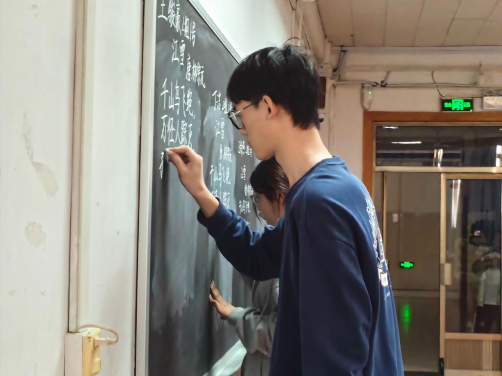 本次粉笔字大赛分为初赛、决赛两个阶段,师范生和非师范生两个组别,面向大二、大三年级全体同学展开。初赛阶段以班级为单位,参赛选手以《江雪》为写作内容,每班推出两名优秀选手参与决赛。决赛阶段,选手需要在规定时间内高质量完成指定作品《江雪》的书写。比赛现场,选手们神情专注地站在黑板前,精神饱满、热情高涨,一笔一划、苍劲有力,展现出扎实的书写功底和独特的艺术风格。选手们的字体或端庄秀丽,或入木三分,或潇洒飘逸,令人赞叹不已。评委们时而点头称赞,时而低声交流,从字体的结构、笔画、章法等多个方面对参赛者的作品进行了认真细致的评选。最终,师范组秦朝阳、李涵瑜,非师范组康金慧同学表现出色,脱颖而出,荣获一等奖。