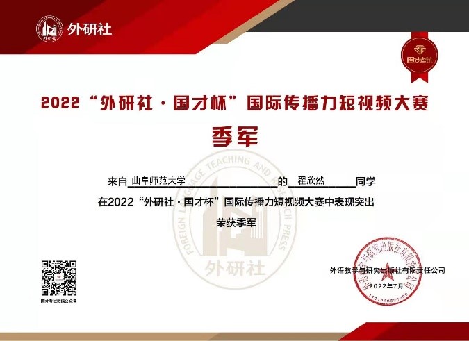 “外研社•国才杯”国际传播力短视频大赛以“理解中国,沟通世界”为理念,以多语种、多视角讲述中国故事为特色,通过短视频形式展现中国,致力于提升大学生的理解能力、思辨能力、跨文化能力和国际传播能力,推进中国故事和中国声音的全球化表达。大赛印证了“记载人类文明,沟通世界文化”的使命格局,更是对高校育人育才的有力促进,为国家国际传播人才培养的创新尝试。