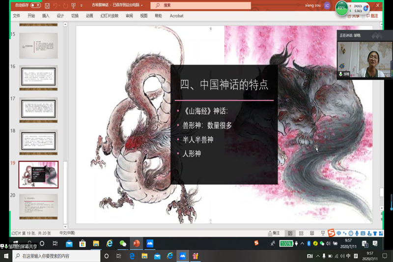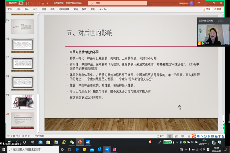 本次古希腊神话学术讲座以古希腊神话的起源与谱系、对人类历史进程的设计、古希腊神话的特点、中国神话的特点、对后世的影响五部分展开讲解。讲座伊始,邹翔教授从“古希腊神话为西方文化的源头”以及“西方文明的东方起源”开始了本次学术讲座。她认为,学习古希腊神话是我们正确地理解西方的文学艺术的一个重要途径。同时,她指出:我们学生要具有人文情怀,不但要心系中国,而且要把眼光要放大放远,具有世界眼光。紧接着邹翔教授讲解了东西方文化的差异性和相似性。讲解结束之后,王秀卿老师发表了感想,邹翔教授也就同学们提出的问题进行了探讨,字字珠玑,引人深思。