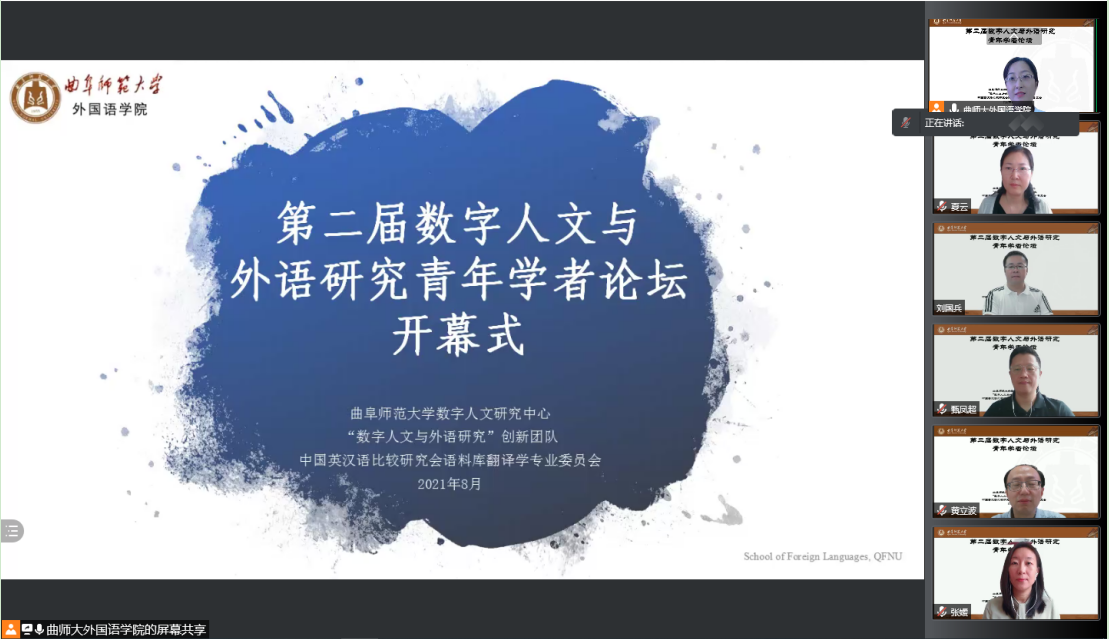 立秋临至,暑去凉来,2021年8月5日,由曲阜师范大学数字人文研究中心、“数字人文与外语研究”创新团队与中国英汉语比较研究会语料库翻译学专业委员会联合主办的“第二届数字人文与外语研究青年学者论坛”在线上成功举办。本次论坛由山东省“数字人文与外语研究”青年创新团队项目资助,邀请国内语言学、外语教学、翻译学和语料库语言学领域的九位青年专家做主旨报告,国内多所高校和研究机构的500余名专家学者齐聚云端,共襄学术盛宴。