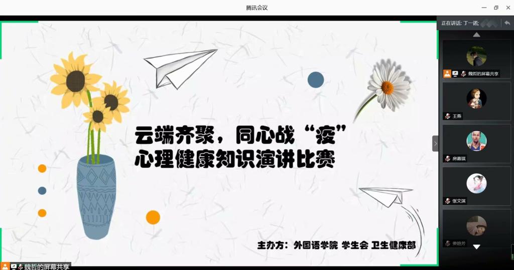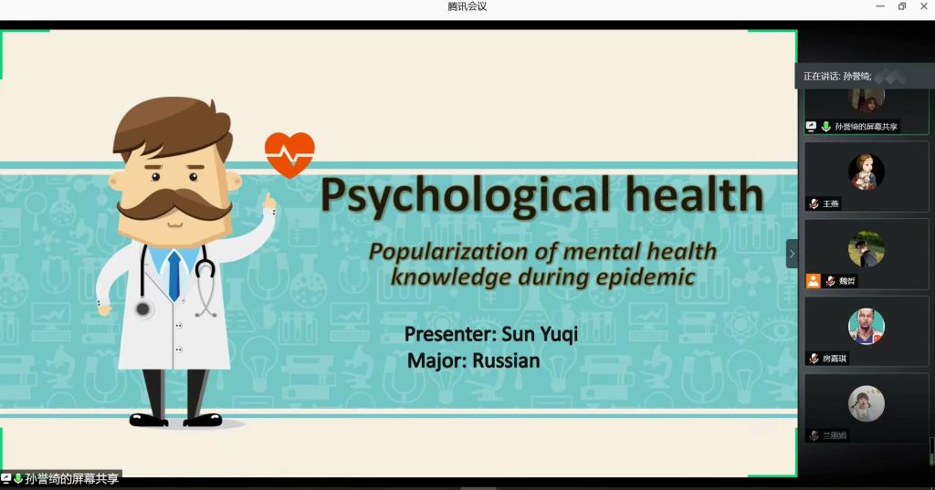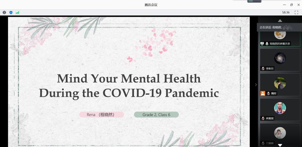 大赛以“普及疫情期间心理健康知识”为主题,要求选手做时长为7分钟的英语定题演讲。选手们的演讲紧密围绕主题展开诠释,用流利的英语讲解心理健康知识、明确心理健康观念、展现正确的生活态度。选手们的英语发音清晰标准,演讲主题鲜明、内容丰富,既展现了自己扎实的英语功底,又展现了对心理健康知识的深入了解。选手们也为比赛制作了精美的PPT,其中包含了丰富的心理健康知识,如与自我对话、自我鼓励、适当运动、保持对前景的期待和训练正向思维等知识。同时,英语演讲的形式也让选手们掌握了相关的英语专业名词。在12位选手的精彩演讲后,线上观众团使用一人一票制进行投票。最后,宗旖同学以标准的发音、流利的口语和自信的态度获得了观众的认可,荣获比赛一等奖。至此,本次心理健康知识演讲比赛圆满结束。