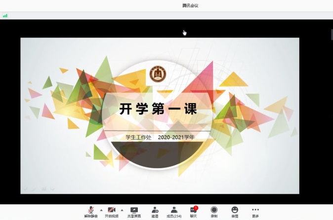 于2020年9月6日下午15时进行《开学第一课》。本学期的《开学第一课》分别由2017级辅导员冀玉珍老师、2018级辅导员王旖旎老师、2019级辅导员张晓老师主讲,直播8