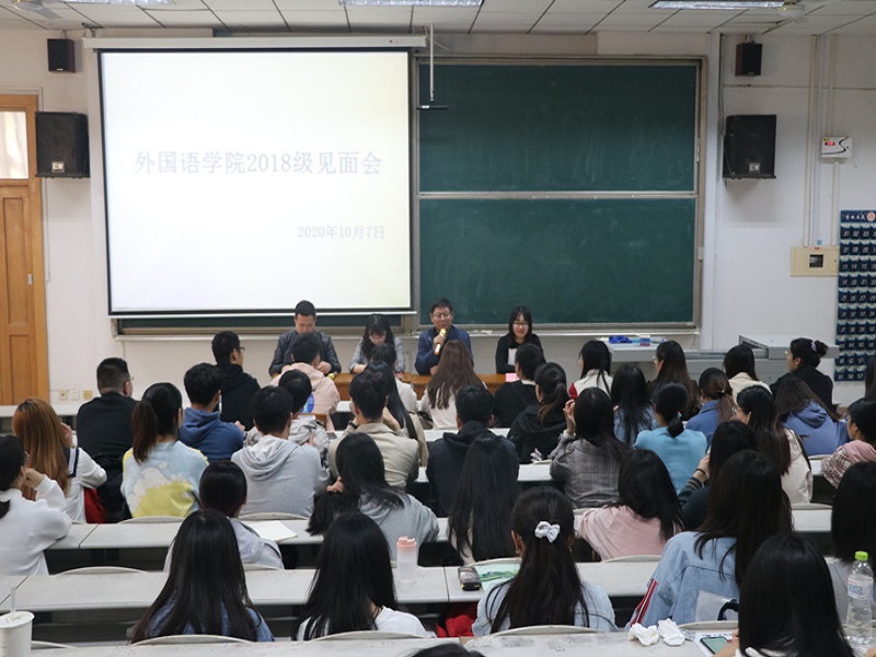 ,并与辅导员取得联系。关于学习方面,他提醒同学们要好好准备专四考试及下学期的实习内容;了解好自己的考研意向,确定目标,并做出相应努力。最后,老师们对迎新工作中辛勤努力的学生会干部表示感谢,祝愿全体2018级外院学子前程似锦、未来光明。
