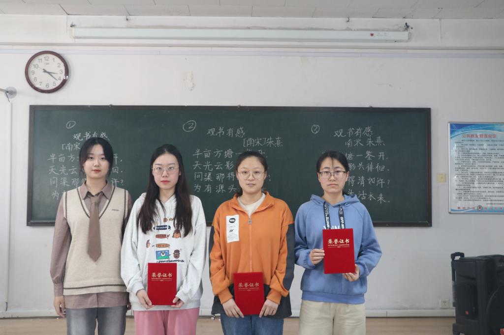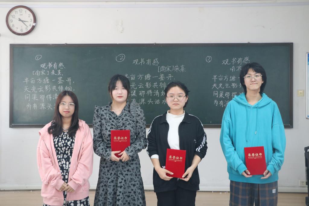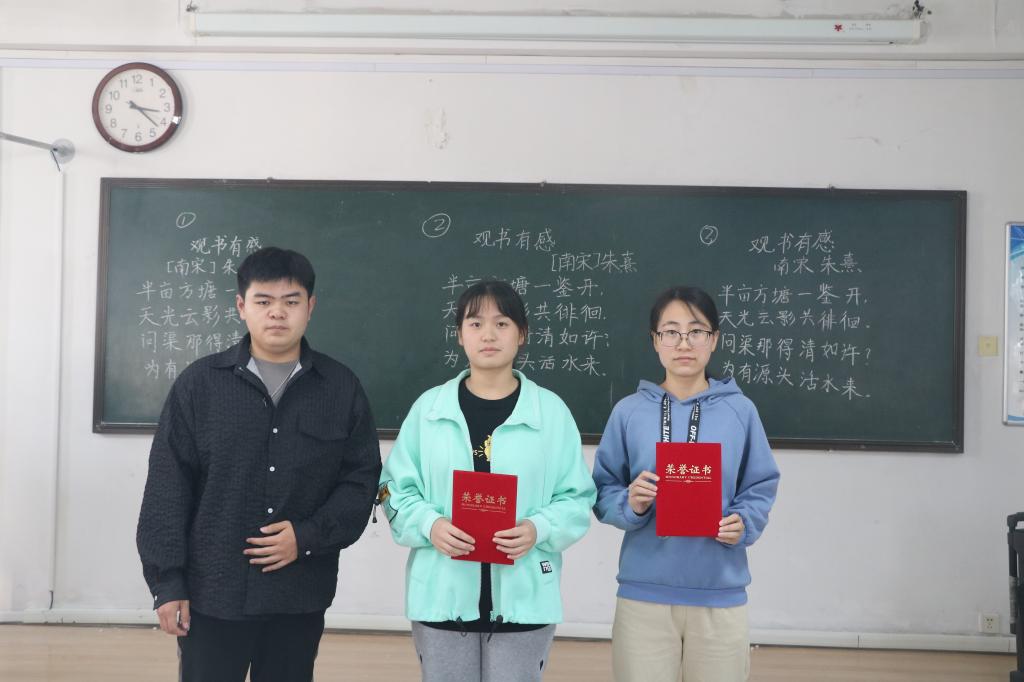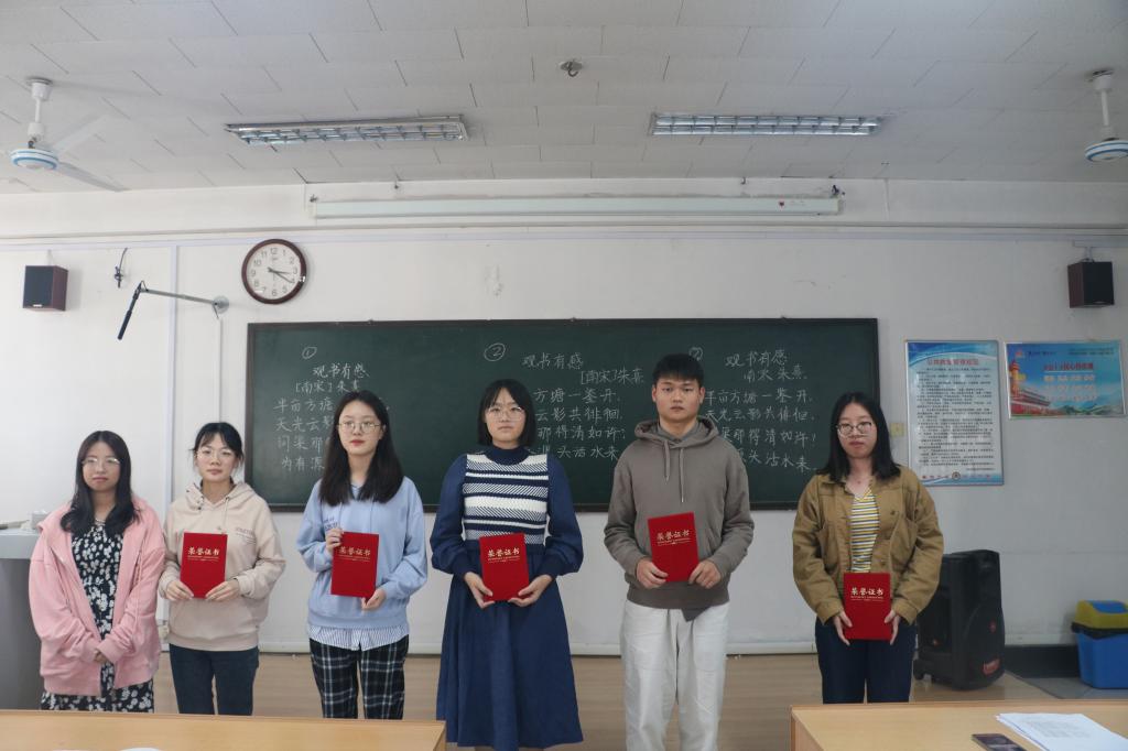 学生凭借过硬的综合素质,在黑板上留下了刚劲有力、酣畅大气的粉笔字,顺利地完成了比赛。随后,评委根据笔法、字法、章法、书写规范和书写效果对作品进行现场评分并做出点评。经过比赛的激烈角逐,评委老师分别为获奖同学颁奖。其中师范类赵晓娜、王晴同学,非师范类齐逸群荣获一等奖,获得一致好评。比赛在现场观众的热烈掌声中落下帷幕。