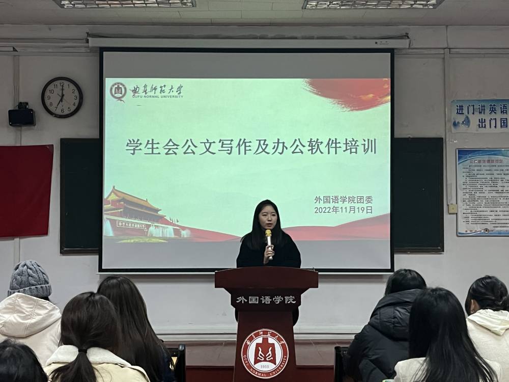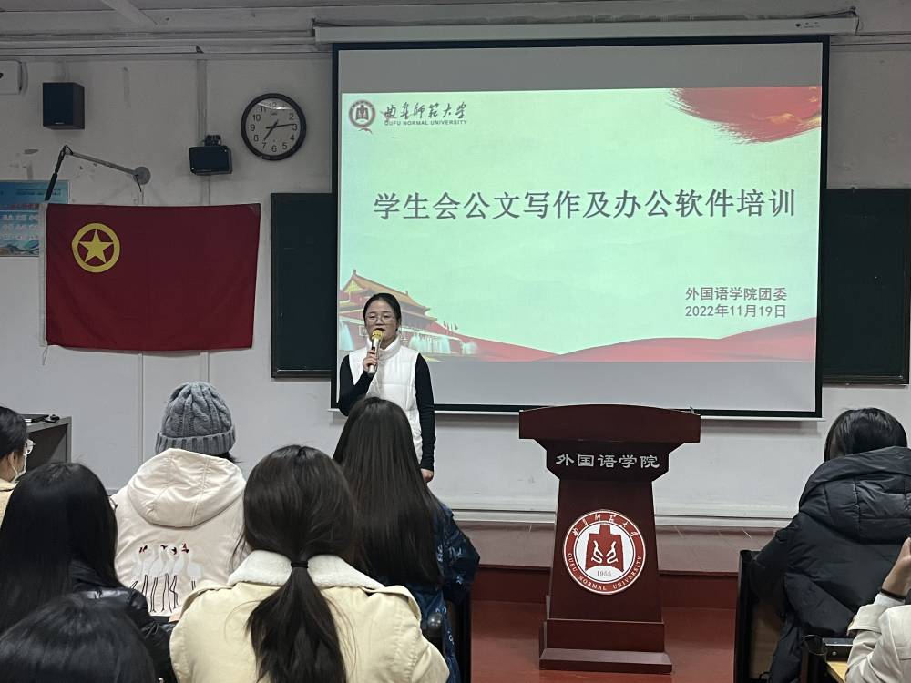 共青团的发展贡献力量。她还表达了对学生干部们未来成长的殷切期盼。随后,学生会副主席李茂凯讲解了在线表格和在线文档的使用,在座同学纷纷表示受益匪浅。王子涵从格式及注意事项方面强调了公文写作的严肃性。之后,曲俊羿讲解了各部门向办公室申报文档的要求,明确了奖项申报的流程和格式;殷玉洁介绍了学生会报销流程和要求,强调了发票和报销单填写以及特殊情况报销的注意事项。最后,在学生会主席王孜淳的主持下,学员们在交流中深刻体会到党的二十大精神与学生工作的关系,游戏时,学员们进行“你划我猜”团队游戏,配合默契、协同合作,现场欢声笑语,其乐融融。
