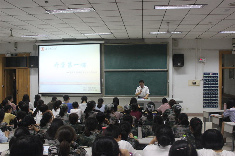 党委副书记王作茂为2019级新生讲授“开学第一课”。“开学第一课”为刚刚步入大学校园的新生们带来了大学学习、生活、工作等方面的帮助与指导。“开学第一课”由2019级辅导员张晓主持,2019级全体新生参加。