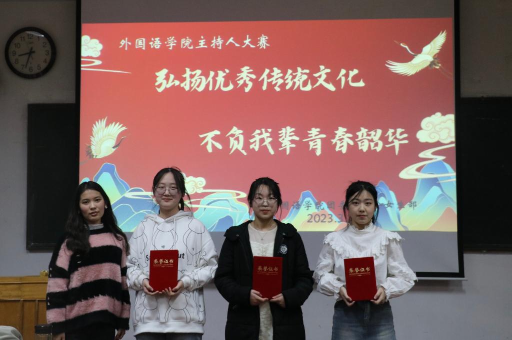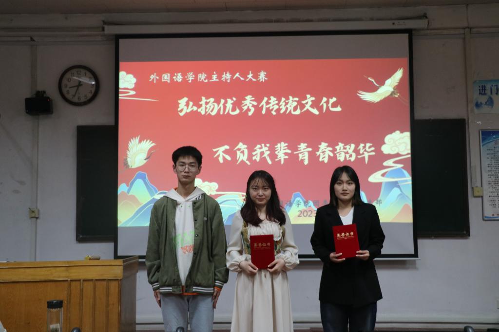 本次比赛由选手定题主持、抽取题目即兴主持、才艺展示三个环节组成,评委进行现场打分。在选手定题主持中,2号选手李燕妮以“曲园诗词大会”为题材,运用大量文言诗句,言简意深,对仗工整,给人以深思和启迪。在抽签主持中,选手们围绕中华优秀传统文化,在有限的时间内进行了精彩的主持表演,激起大家对中华优秀传统文化的共鸣。最后才艺展示环节,选手们悦耳的歌声,激情的朗诵感染了在场的每一位观众,带领大家感受源远流长、博大精深的中华优秀传统文化。经过三个环节的精彩角逐,李燕妮荣获一等奖,孙凡舒、赵乐冉荣获二等奖,王舜菡、左峻齐、田桂东荣获三等奖。
