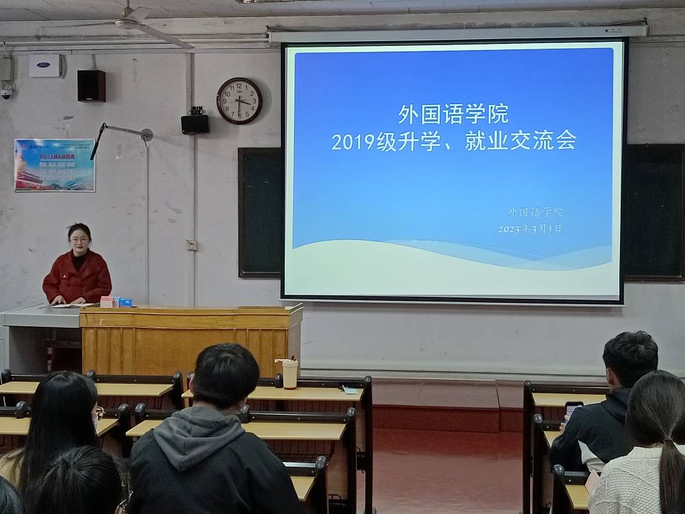 为进一步推进毕业生升学、就业指导工作,帮助毕业生了解当前升学形势、确定就业方向,3月1日下午,直播8官网 在系楼201教室举办了2019级升学、就业交流会。本次会议由直播8官网 团委副书记张晓主持,由直播8官网 党委副书记王作茂主讲,数学科学直播8 团委副书记徐腾飞,辅导员赵彤、刘翔、韦宁,直播8官网 辅导员赵文彬、王伟、王仁杰受邀出席,2019级全体同学参加。