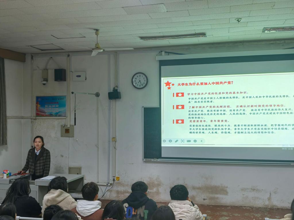 党组织有了初步的认识。其次,她从党的光辉历史到党的性质、宗旨和使命方面深入普及了党的基本知识。随后,她强调了入党的严肃性和规范性,让同学们明白入党不仅是一种荣誉,更是一份责任和担当。最后,她鼓励各位新生积极进取,以实际行动向党组织靠拢,预祝同学们早日成为一名优秀的中国共产党员,为实现中华民族伟大复兴的中国梦而努力奋斗。