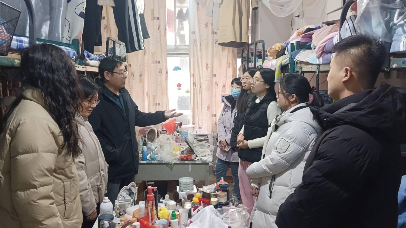 党委副书记王作茂一起带领团委副书记张晓、辅导员赵文彬、王伟、王仁杰走进学生宿舍、教室和食堂等场所开展一系列工作。