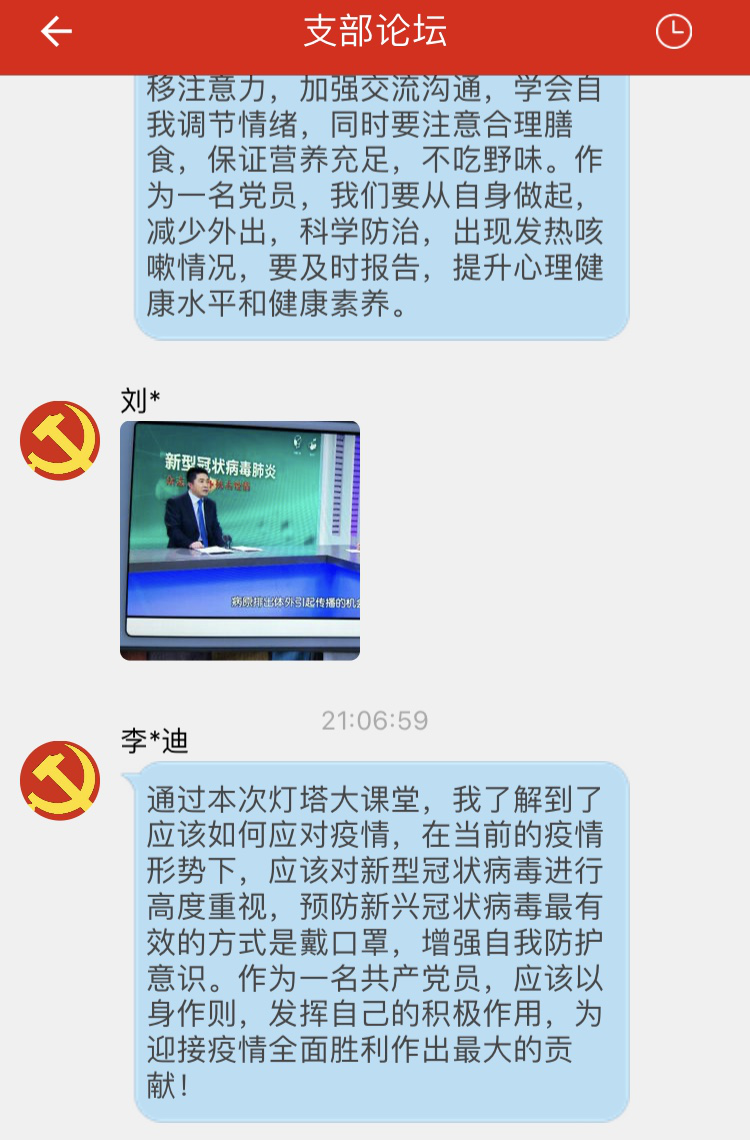 网络学习结束后,大家又通过“灯塔--党建在线”学习平台中的“支部论坛”积极发表自己的所感所得,并纷纷表示要科学面对新冠疫情,掌握更全面的防疫知识,同时也要调整自己的身心,确保自己身心健康,为开学后服务帮助同学做全面积极的准备。我们坚信:疫情很快就会过去,我们终将与大自然拥抱!