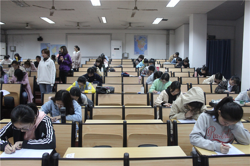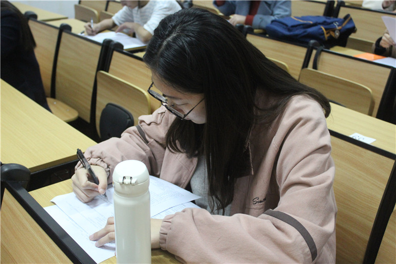 首先,在主持人简述此次竞赛的要求和内容后,各位选手在组织者的引导下有序的将手机放入手机袋,此举确保了竞赛公平公正。随后,考卷也发到了答题人的手中,紧张的答题开始了。此次考题的类型有选择、填空、判断、简答,既有基础知识的考查,又注重同学们对现实问题的深入理解和思考,加深同学们对十九大精神的认识。在仔细审题后,选手们沉着冷静的答着题,手中的笔在卷子上飞快的写着,时而也会有同学眉头微蹙,但都仔细思考,似在熟思十九大、细品十九大。大约半个小时后,答完题的同学们陆续交卷离场,长舒一口气,脸上露出满意的笑容。