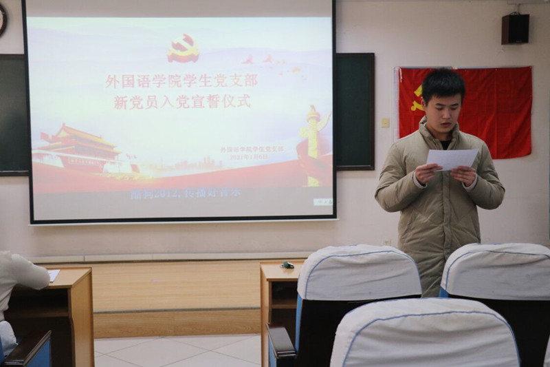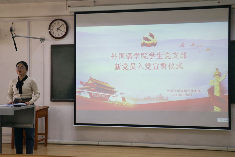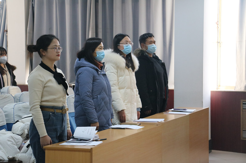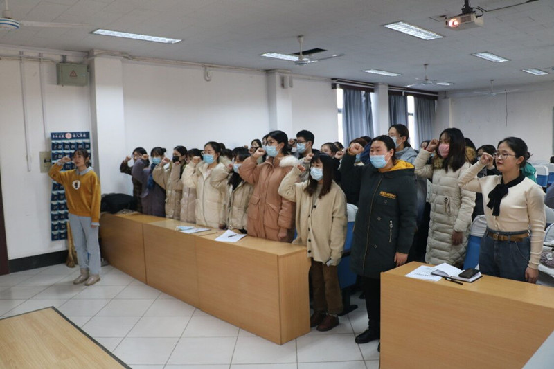 1月6日下午,直播8官网 于外语楼301室成功举行预备党员入党宣誓仪式。直播8官网 党支部书记张晓,2017级辅导员冀玉珍,2018级辅导员赵文彬,2020级辅导员王伟出席仪式。学生党支部全体党员及全体新发展预备党员参加。仪式党支部组织委员郑雯雯主持。