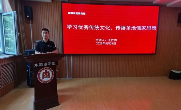 5月24日,本科生第二党支部书记王仁杰以“学习优秀传统文化,传播圣地儒家思想”为主题,讲授了以儒家文化为代表的中华优秀传统文化的丰富哲学思想和重要时代价值。全体党员应持续推动中华优秀传统文化新发展,使其与现代社会相协调、与人们精神文化需求相契合,以党的二十大精神为引领,坚持以人民为中心的创作导向,传承中华优秀传统文化;激励全体学生党员从以下三方面做起,以切实行动践行党的二十大精神:一、研习儒学思想,汲取文化精髓;二、继承儒学传统,创新发展之路;三、传播儒学思想,勇担时代使命。
