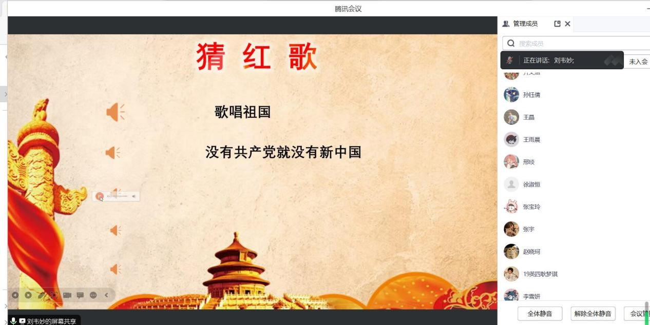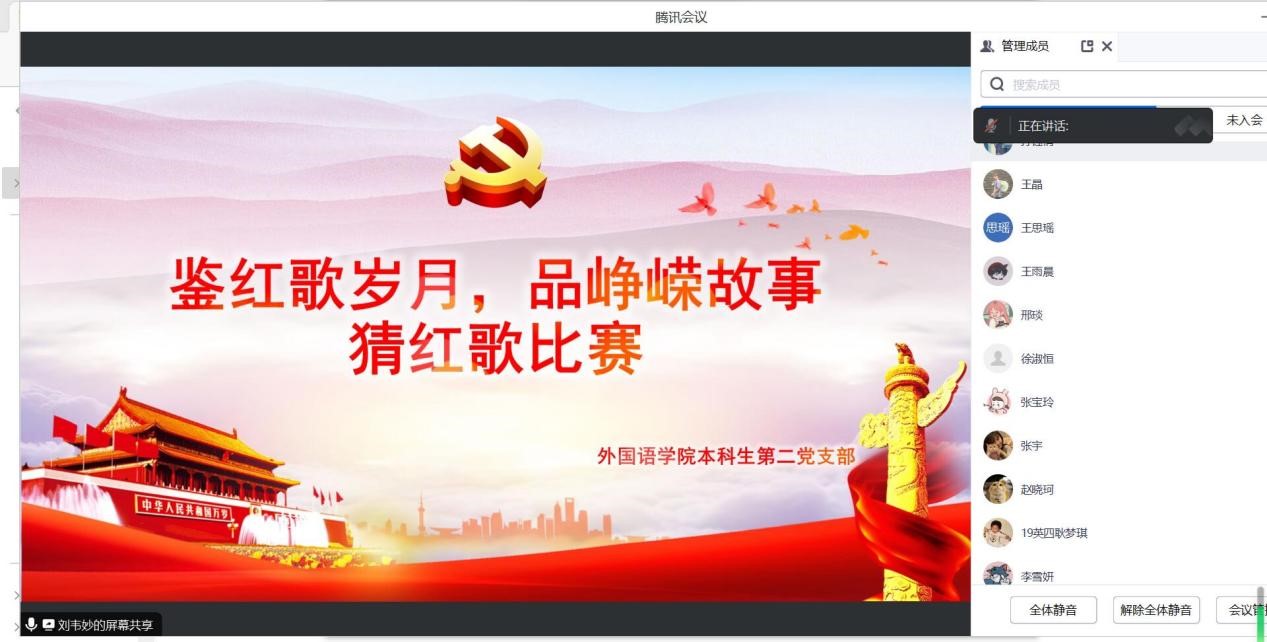 5.“鉴红歌岁月,品峥嵘故事”之猜红歌比赛。活动前期,下发猜红歌比赛通知,鼓励党员们积极学习各首红歌。活动中,支部全体党员积极参与猜歌活动,通过猜歌名并继续哼唱的形式重温一首首红歌,感受红歌背后的红色故事,体会歌曲中传颂的自强不息、勤劳勇敢等民族精神。活动最后,支部全体党员齐唱《我与我的祖国》。此次活动激发了党员的爱国热情,重温了党的光辉历史。
