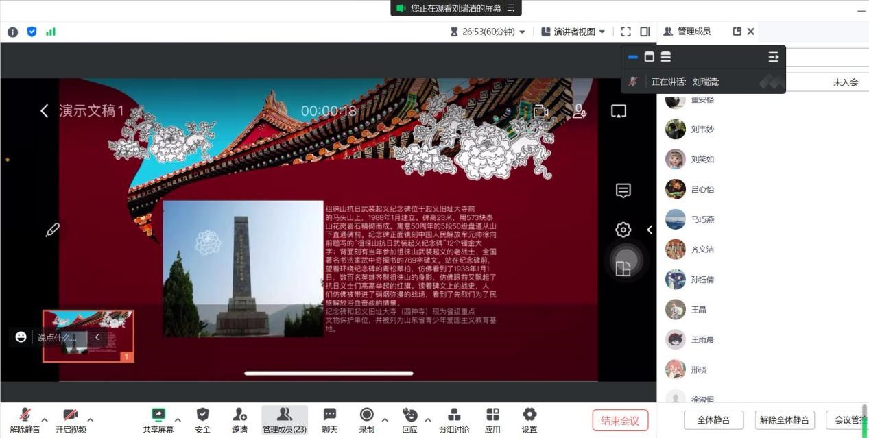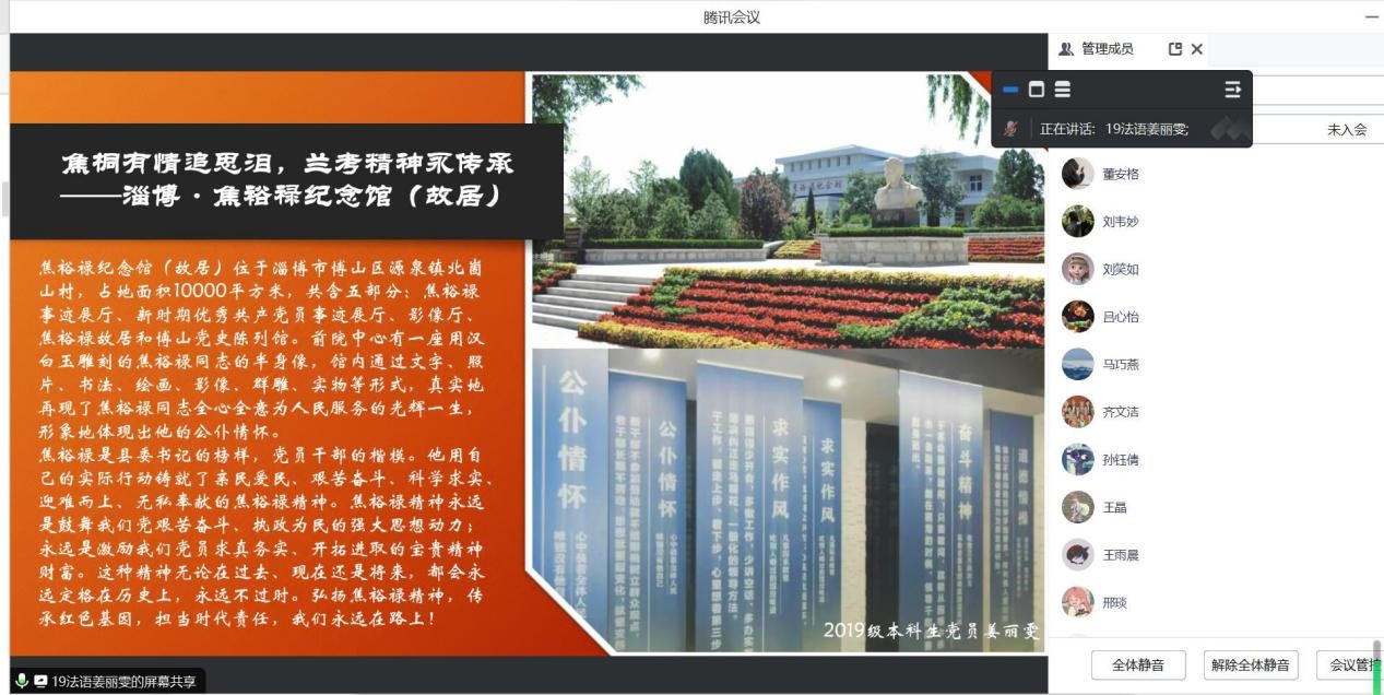 本科生第二党支部举办了家乡红色遗址分享活动。其中,来自泰安地区的党员代表刘瑞清同志介绍了家乡徂徕山抗日武装起义纪念碑和来自淄博地区的党员代表姜丽雯同志介绍了焦裕禄纪念馆,通过他们的介绍,党员们进一步了解了红色遗迹背后的故事,并交流感悟。通过此次活动,支部全体党员共同回顾红色记忆,提高了学习红色故事的积极性。