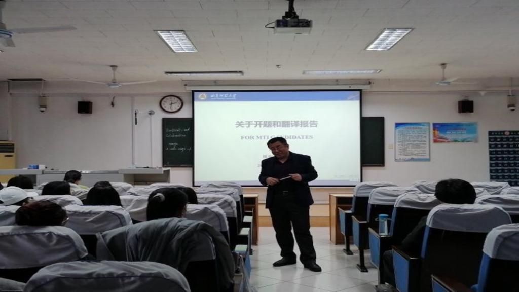 会议伊始,主持人向大家简要介绍了本次会议的与会老师。会中,付老师通过五个部分对大家进行指导。首先,付老师强调了翻译方向的培养目标是培养具有国际视野、高素养、能力强、应用型、专业化的翻译人才。其次,付老师讲解了本专业应掌握的基本知识,即了解母语和目标外语的语言知识、掌握基本的翻译概念和理论、了解百科知识以及了解信息技术在语言上的用途。第三,付老师强调了学生应掌握的专业知识包括翻译理论与实践知识、语言服务产业的相关专业知识和与所翻译内容相关的专业知识。第四,付老师与学生们分享了学位论文选题要求、论文形式和规范要求、以及针对翻译专业的论文水平要求。第五,付老师向同学们详细介绍了论文开题的定义、目的、结构,并向学生们展示了开题报告的示例。最后,针对翻译报告,付老师从定义、选题、写作基本要求、理论支持、摘要、正文及其他问题给出了详细解释。