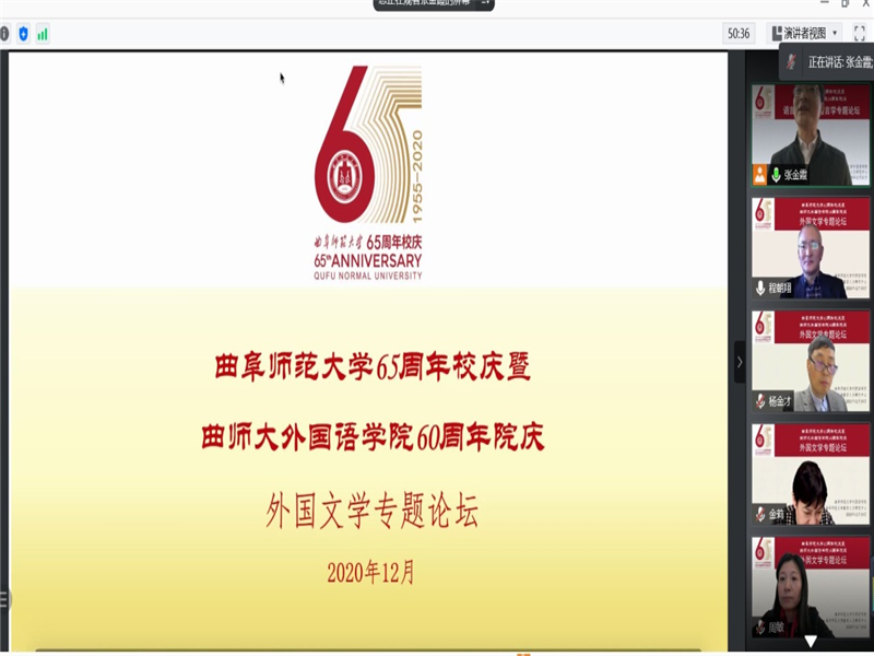 首先,南京大学的杨金才教授就新世纪外国文学的创作和发展趋势展开讲解。接着,北京大学、石河子大学的程朝翔教授对新文科与文学的关系展开深刻探讨。随后,美国爱丁堡大学的黄桂友教授就文学研究的目的性与实用性展开了专题分享。然后,杭州师范大学的周敏教授介绍了英国文化研究对外国文学课程思政的启迪。之后,清华大学的曹莉教授介绍了英国文学在剑桥大学的兴起。山东大学的申富英教授分享了新文科建设与外国文学知识谱系。最后,曲阜师范大学的林瑛副教授对本次论坛做总结发言并感谢各位专家学者的学术分享。