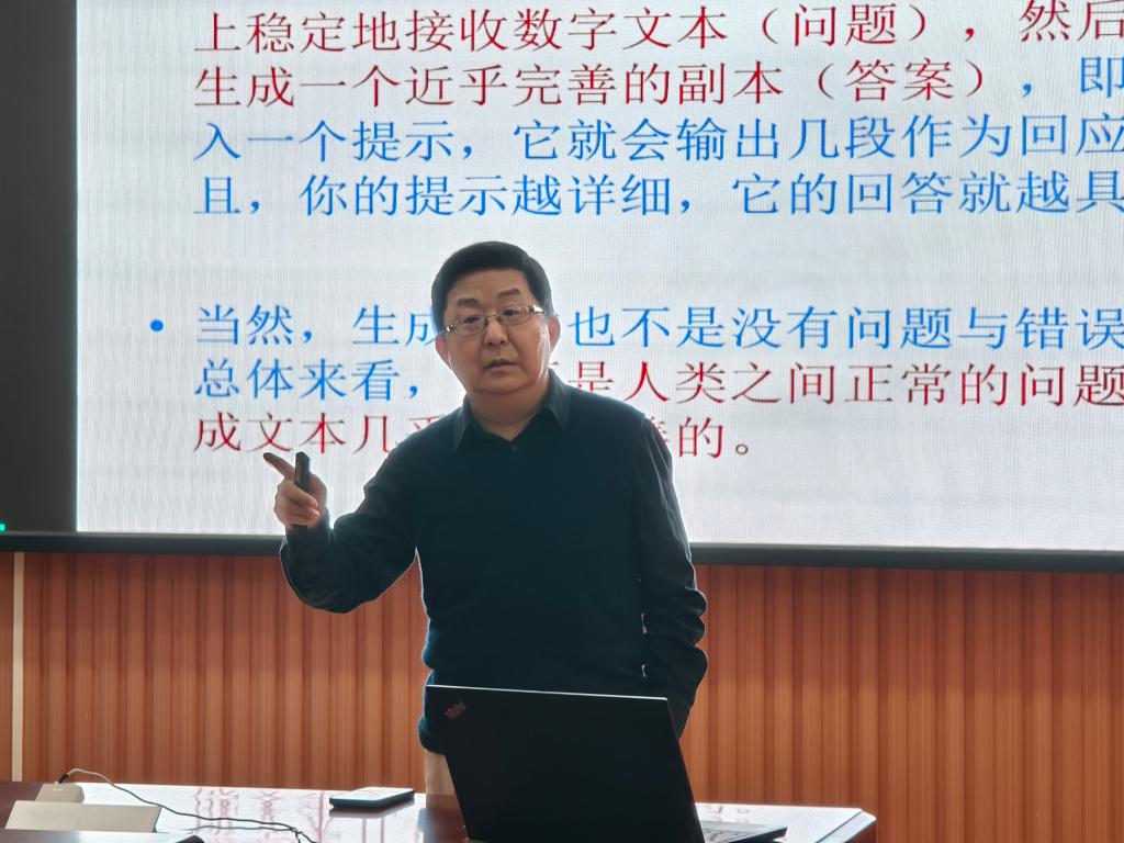 三位特邀专家先后进行专题讲座,教师与研究生们认真聆听。王克非教授首先进行发言,他就学术意识的提升这一主题,展开说明了外语学科的发展历史和在新时代外语学科的转型与外语教师的观念转变,并从学习与研究两个角度指出教师要培养和提升学术意识以更好地适应新的时代。梁茂成教授的讲座题目为“大语言模型驱动的学科知识图谱构建”,他提到了大语言模型在语言研究和语言教学领域的广阔应用前景,并讲解了相关研究的具体流程,点明研究对各类专业知识图谱构建具有重要启示。最后郭英剑教授探讨了人工智能时代的外语专业建设与未来发展,以ChatGPT为典型讨论了它对人文学科、外语专业与外语教育的深刻影响,并试图解答在ChatGPT时代外语专业的建设与培育问题和教师的个人发展问题。