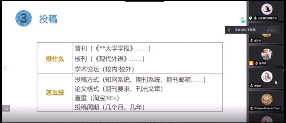 然后,七位经验介绍人分别传授了宝贵的个人经验,她们用精彩的PPT呈现了一部部奋斗史、一个个优秀事迹。孙娜娜同学向大家介绍了研究生时间管理的问题,明确学习目标、创造学习氛围能够帮助大家提高学习的专注度;朱晓婷同学结合自己的论文写作经验,分享了适合硕士研究生投稿的刊物类型;段明月同学提出参加师范生教学技能大赛是“以赛促学”的好方式,并详细介绍了参赛的流程和内容以及注意事项;隋玉双同学强调了关于课程学习的重要问题,提出课前做好预习、课上积极参与、课后完善笔记是一名研究生必备的学习素养和技能;王慧慧同学基于过往的论文写作与发表流程,分享了自己的投稿心路历程;成晓宁同学主要讲述了翻译硕士的专业实践,强调了理论转化为实践的重要性;刘国卿同学分享了研究生生涯的目标管理,鼓励大家化整为零、循序渐进。