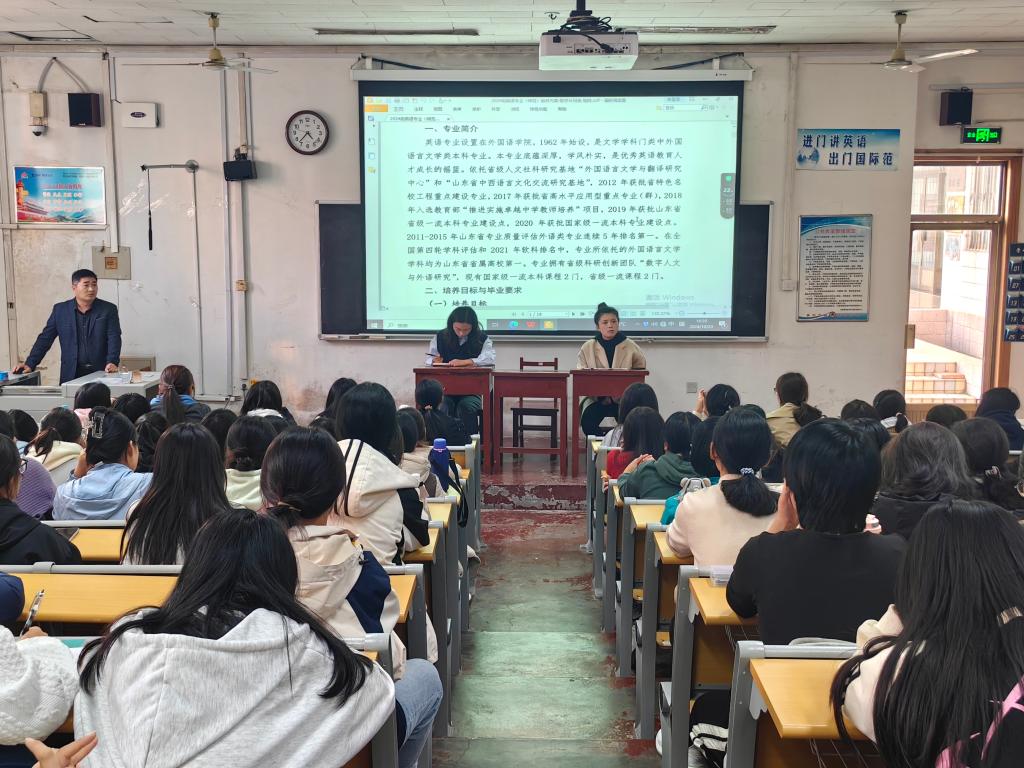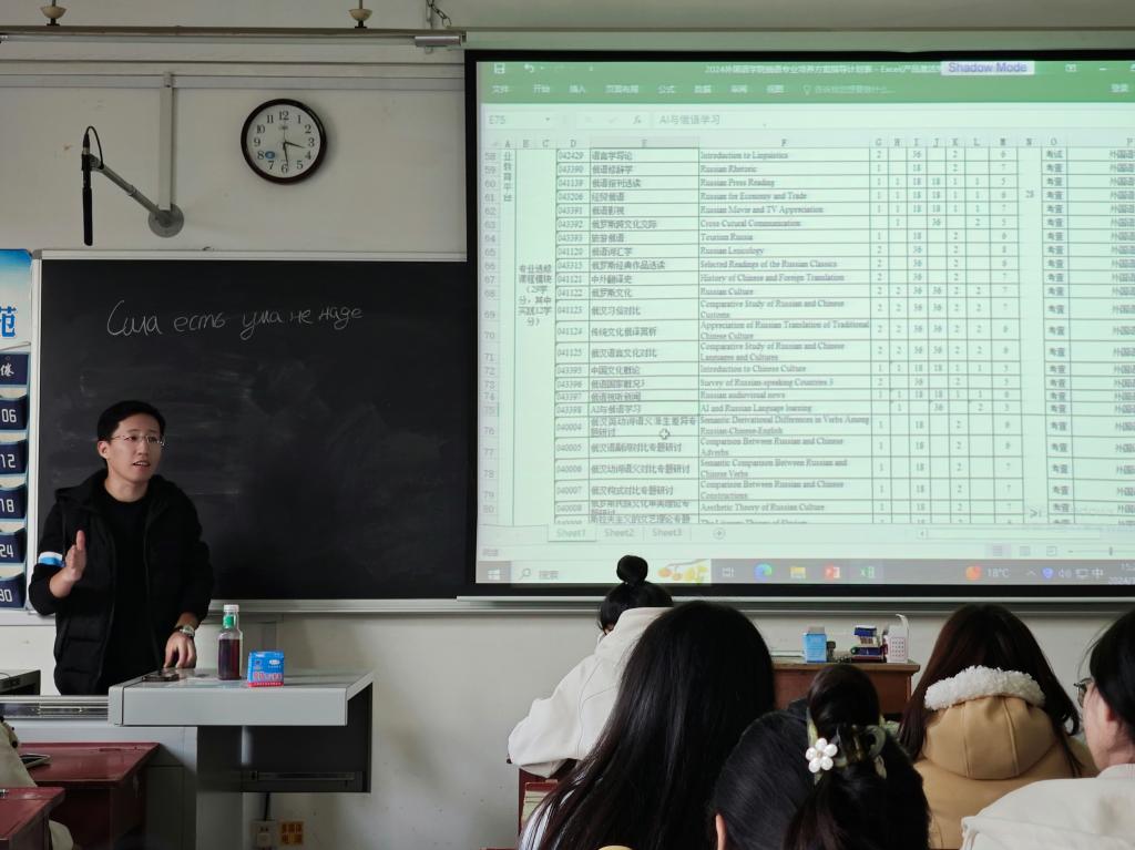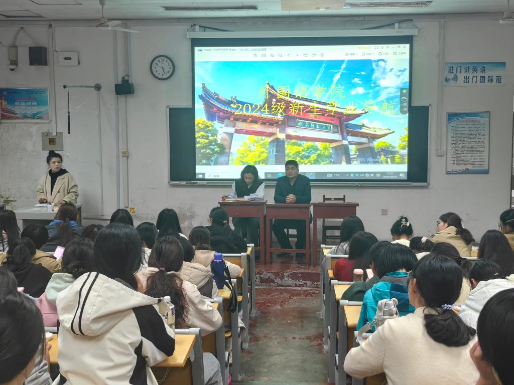 副院长邢加新、俄语专业主任田守欣、法语专业主任唐友霞以及教务老师李娜主讲,2024级辅导员王伟老师主持。