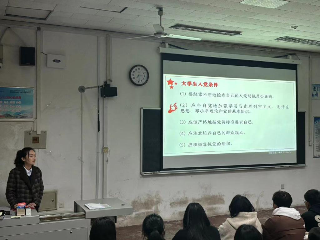 党组织有了初步的认识。其次,她从党的光辉历史到党的性质、宗旨和使命方面深入普及了党的基本知识。随后,她强调了入党的严肃性和规范性,让同学们明白入党不仅是一种荣誉,更是一份责任和担当。最后,她鼓励各位新生积极进取,以实际行动向党组织靠拢,预祝同学们早日成为一名优秀的中国共产党员,为实现中华民族伟大复兴的中国梦而努力奋斗。